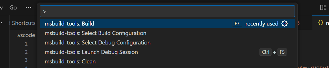 You can also debug within the VS Code environment. Use the Command Bar (Ctrl+Shift+p) and type "msbuild" to see possible commands (see screenshot below).